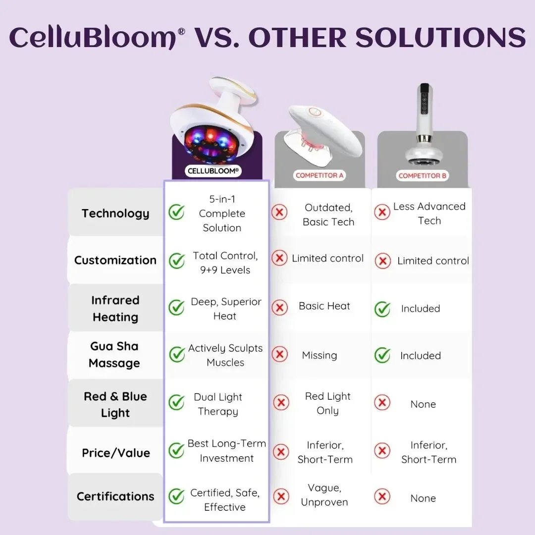 CelluBloom® combines 5 advanced technologies — dynamic cupping, Gua Sha massage, red-light therapy, blue-light therapy, and soothing heat — to target cellulite, firm loose skin, and restore your skin’s natural glow.